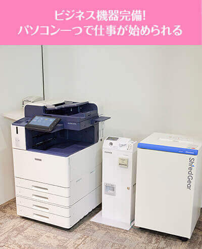 また、デスクやイスはもちろん、インターネット回線や複合機やシュレッダー等ビジネスに必要な機能は当施設で事前に準備しています。